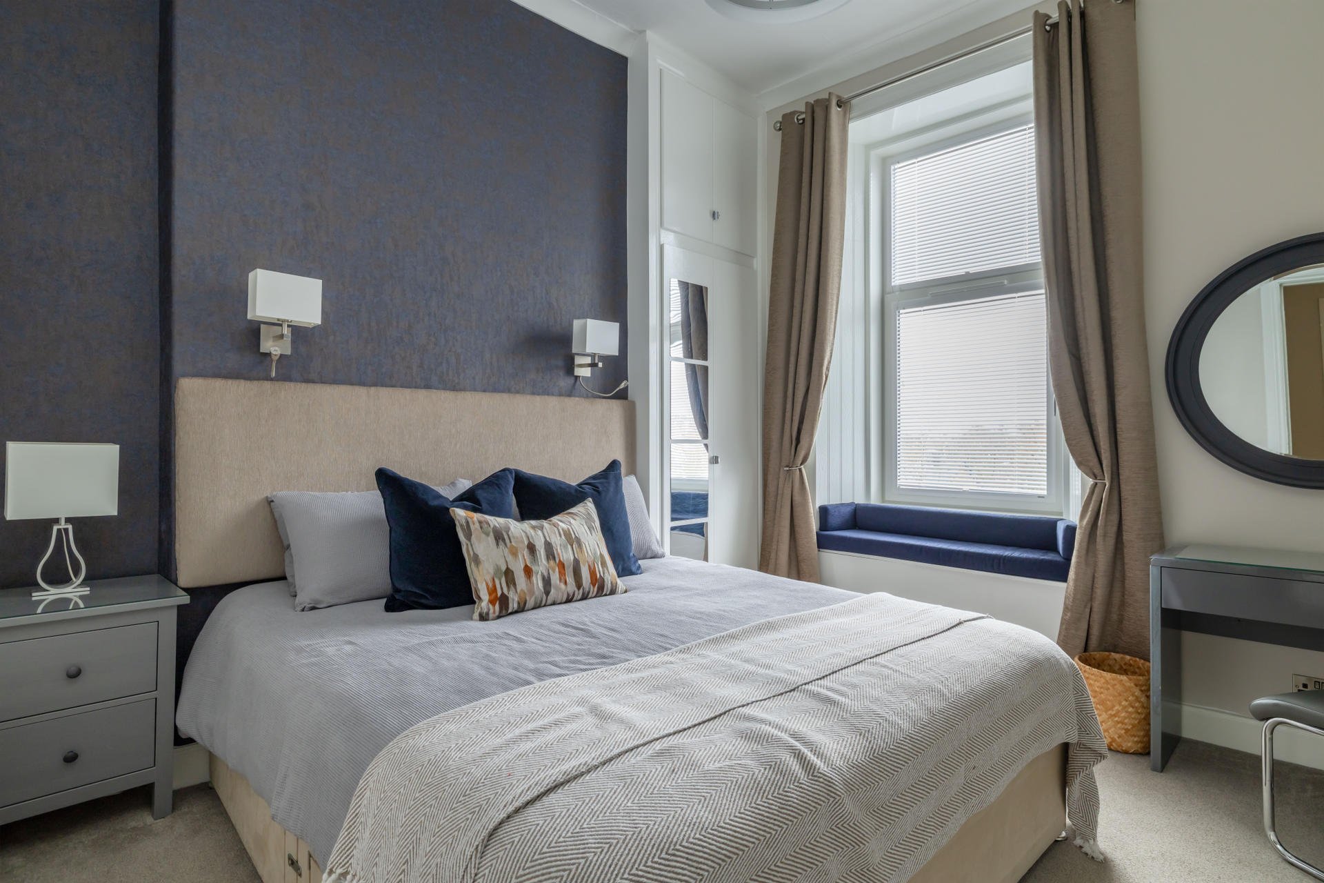 The living room has a beautiful bay window, where you can sit and enjoy a meal. The original fireplace has been retained, as well as the cornice. The apartment has been furnished with smart, modern furniture, which complements the original features beautifully. If you wish to enjoy quiet night at home, we have WiFi, a computer area, and flat screen smart TV with Netflix. The galley kitchen has everything you would expect, including microwave and washing machine, and is both attractive and convenient.
